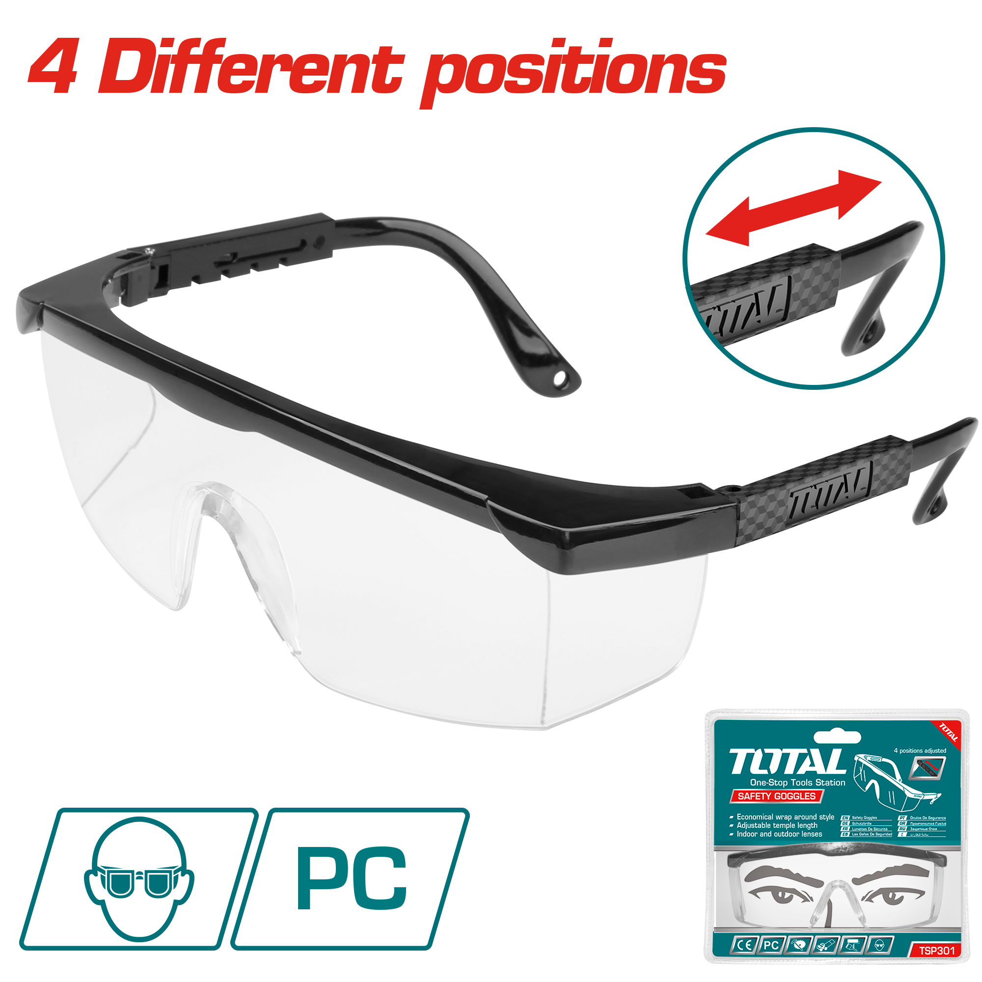 The length of temple can be adjusted in 4 different positions, temple line can be added for easier and safer use.